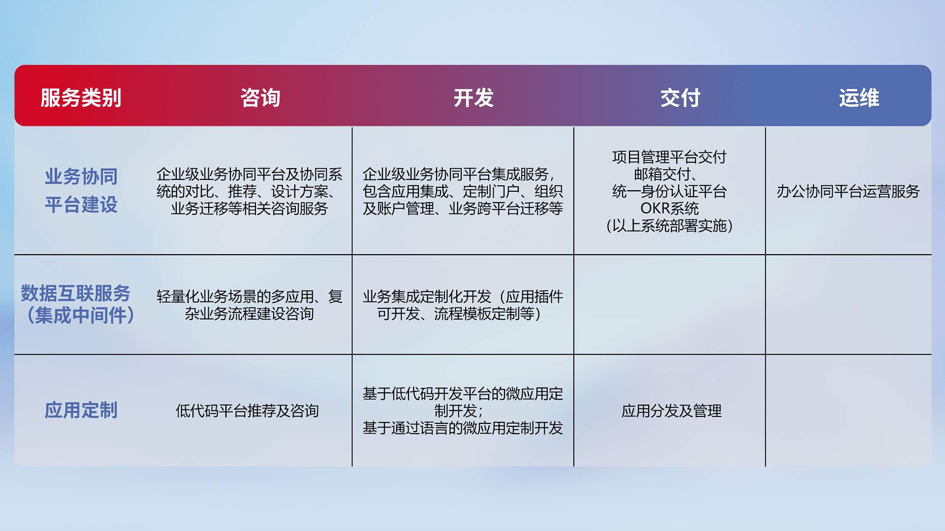 针对钉钉、、、、企微、、、、IDaas等平台级产品提供产品的规划、、方案、、交付、、定制化开发等服务,,实现如统一协同办公、、、、智能客户服务、、、混合会议管理、、、、智能数据查询、、、等业务场景,,,实现数字化转型。。。。